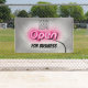 Open pink neon sign. Personalize by uploading your logo and change for business message and background if needed.