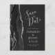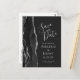This elegant modern save the date postcard features a black watercolor agate border trimmed with faux silver glitter. The customizable text is light silver grey on a charcoal grey background. The reverse side repeats the information, along with a customizable return address.