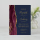 The left-hand edge of this elegant modern wedding invitation features a burgundy red watercolor agate border trimmed with faux gold glitter. The customizable text combines handwriting, copperplate and italic fonts in real gold foil on a navy blue background. The reverse side features a matching burgundy and gold agate design.