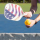 Create your own personalized custom pickleball paddle featuring an American flag with a name, monogram or other text in your choice of font style and colour (shown in blue. Make one for yourself or as a gift for the patriotic pickler or pickleball player you know. PADDLE OPTIONS: Choose from Black, Tan or White edging and grip colours on the ordering page. ASSISTANCE: For help with design modification or personalization, colour change, transferring the design to another product or if you would like coordinating items, contact the designer BEFORE ORDERING via the Zazzle Chat MESSAGE tab below or email makeitaboutyoustore@gmail.com.