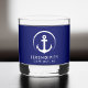 A chic minimal nautical-themed navy blue whiskey glass for your boat featuring a modern white illustration of an anchor that you can keep or replace with your boat's logo. Personalize with your boat's name and location in simple white typography.