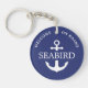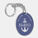 Anchor keychain with custom name and boat name. Stylish, nautical "Welcome On Board" keychain design template features a minimalist white anchor logo and placeholders for your boat name on an ocean blue background. Reverse side with space for skippers's name, a tagline and your contact details. Background colour is customizable. This easy-to-customize elegant anchor keychain makes a great promotional item for coastal professions and a smart gift for personal use © y.BEE SEA