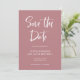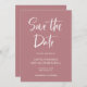 This ultra modern, on-trend wedding save the date card features a mix of trendy white handwritten script typography and slab serif text, on a dusty rose coloured background. An elegant and simple announcement that will stand out as soon as your guests open the envelope.