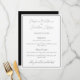 This modern and elegant event or wedding menu features a simple white background with black text. The names of the couple are printed in a script font. You can personalize the menu items with your own food options.