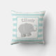 Elephant throw pillow features an adorable little newborn baby elephant calf with heart shaped splashes and a stripe patterned background. Modern aqua blue, grey, and white colour scheme - perfect for a baby boy. Personalize the grey monogram text with your child's name.