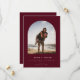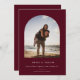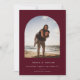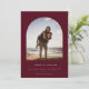Modern arch frame, flat save the date photo card. Minimalist typography design style template with solid burgundy colour backgrounds.