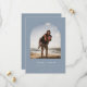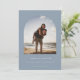 Modern arch frame, flat save the date photo card. Minimalist typography design style template with solid dusty blue colour backgrounds.