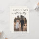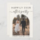 Modern light cream elopement or private wedding announcement and reception invitation. The front features your photo in a boho-inspired arch frame and "Happily Ever After Party" in simple typography and a stylish script with swashes. Add your first names and wedding or reception date. On the back, personalize your details and add your names in a signature-like script.