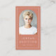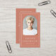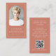 Modern, vertical, terracotta brown or custom colour business cards with your arch shaped photo, name and title on the front, with a thin white border along the edge of the card. Customizable template fields for your contact information, social media and QR code on the back. You can change background and font colours, move and resize elements with the design tool.