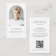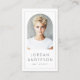 Modern, vertical, white or custom colour business cards with your arch shaped photo, name and title on the front, with a thin light grey border along the edge of the card. Customizable template fields for your contact information, social media and QR code on the back. You can change background and font colours, move and resize elements with the design tool.