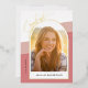 This stunning gold foil graduation party invitation features an arched photo on the front and a second one the back. The design is accented with a rose coloured wavy shaped background. The word "graduate" appears in a gold foil modern script. The arched photo, on the front, offers a gold foil border. Custom text, on the back, allows you to add your party invitation details.