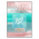 PixDezines table numbers card with modern art. Trendy watercolor swatches in blush pink, aqua, teal, sage, mint faux silver and rose gold. All elements are editable including the iridescent label, one can replace it with any shape available in the design tools.
