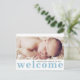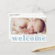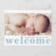 You can easily share your exciting news with this photo birth announcement postcard. On the front of the card, custom blue text (shown as "welcome") appears below a large photo. Your baby's name and birth date are also featured on the front. The back of the postcard includes space to write a personal message to recipients.