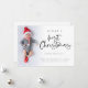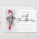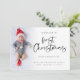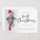 Modern Baby First Christmas Custom Photo Card. Available digitally and printed. Lovely to celebrate your baby's first Christmas. A playful set script for First Christmas and the rest of the text is easy to personalise. Replace the sample photo with your own. A gradient overlay layer is on top of your photo so it fades out as it reaches the centre with the text partially overlaid on top.