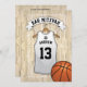 Casual mitzvah party invitations featuring a basketball court background, a white jersey with your childs name, number and the star of david. On the reverse is the bar mitzvah celebration details with a basketball at the bottom.