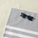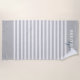 White stripes on a light grey background and a customizable family name on the bottom. Check our store for more monogram beach towel options.