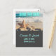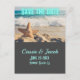 Modern, vertical non-traditional Save the Date announcement features beach scene (that includes waves and starfish in the sand) photography background with Save the Date in aqua blue neon. Personalize with wedding couple's details on dark grey background.