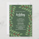 An invitation that can be used for a holiday party or open house. It is stylish enough to use for your corporate events or a holiday office party. The modern, abstract design includes eucalyptus branches and berries and sans serif type for the main part of the text. The greeting is in a rustic modern script. The back includes a eucalyptus pattern in greens.