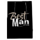 Modern Best Man medium gift bag. Contemporary text in brownish grey and white on a black background with wedding date in classic block text at bottom right. The wedding date can be removed by clearing the text field, or changed to personalize with the best man's name or bride and groom initials.
