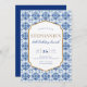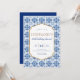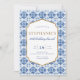A modern, elegant 30th birthday brunch invitation featuring watercolor blue tiles inspired by the Mediterranean traditions and a sequined golden frame (these are digital effects). Personalize it with the name, the date, the time and all the details. Modern calligraphy for the title. A lovely invite for a young woman of thirty, on her thirtieth birthday: daughter, girlfriend, wife, sister etc.