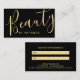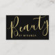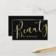 This appointment card features word "Beauty" in gold modern calligraphy font style on front side with details in gold modern sans serif font style on back side, on black background.