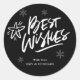 Modern Black and White Best Wishes Classic Round Sticker. Personalize it with your name. You can make the snowflakes big or small and keep them wherever you want.