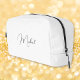 Create your own custom, personalized, beautiful modern elegant black script / typography monogram monogrammed, durable Polyester Poplin, sturdy polyester fabric mens womens kids solid plain white cosmetic makeup toiletry organizer golf beach accessory gym travel dopp kit bag pouch with a zippered closure, two interior mesh pockets - one zippered and one elastic, and a convenient carry-handle that doubles as a hanging strap. Simply type in your name / initials / monogram, to customize. Make a great gift for birthday, fathers day, mothers day, christmas, holidays, new years, wedding, marriage anniversary, and more, for your loved ones, mom, dad, husband, wife, bride, groom, bridesmaid, groomsmen, son, daughter, sister, brother, grandpa, grandma, grandparents, grandkids, kids, family and friends.