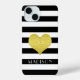 Modern Black And White Stripes Gold Heart Name iPhone 15 Case.
