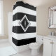 Update your bathroom with a new Modern Black and White Stripes Monogram Letter Shower Curtain. This design has four black wide horizontal stripes on white background. Large white trendy skinny lettering monogram is on the centre of diamond shaped frame. Click personalize template option and enter your initial.