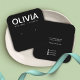 Simple black background square earring display holder with two printed hole "markers". Rounded corners and bold modern typography.