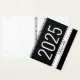 Personalized undated planner in black and white with a simple stripe and large print year and fun brush script name or custom subject or title printed on the cover. Pick a new background colour for the front and back cover by clicking 'customize further'.
