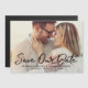 Announce your wedding date to family and friends! This modern wedding save the date announcement magnet design features a horizontal photo of the engaged couple on the front with a white brushed "Save our Date" calligraphy script overlay and a monogram of bride and groom names and wedding date that can be personalized. Note, the white text colour can be modified.