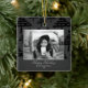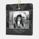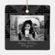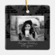 Modern Black Christmas Tree Photo Holiday Ceramic Ornament. The ornament is in white, black and grey colour scheme - with photo, Happy holidays wish, your personal note and a year number in trendy white script. Black abstract Christmas tree pattern is on the front and the backside. Insert your favourite photo into the template - black and white photo matches very well with the design. Personalize this ornament with your name and year number. It`s a great design for family, couple or single people.