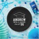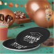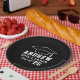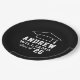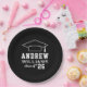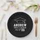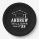 Custom round graduation paper plates features a classic black and white typography design (can be modified via "Customize It!") with a graduation cap and custom text for the grad's name and class year.