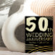 Modern 50th Wedding anniversary invitation template. Simple and elegant typography with curved line detail in gold on a black background. All your party details are contained on the back of the card with a personal photo.