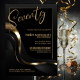 Celebrate your milestone 70th birthday in style with our chic and sophisticated black party invitation. With its customizable text, you can personalize the invitation. This invitation features a fine gold frame that encloses the text, adding a touch of luxury to your special occasion. The gold and grey abstract wavy ribbon design adds a modern and stylish look to the invitation and creates a sense of flow and movement. The overall design is understated yet beautiful, making it perfect for those who prefer a more refined aesthetic.