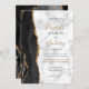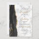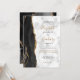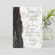 The left-hand edge of this elegant modern wedding invitation features a black watercolor agate border trimmed with faux gold glitter. The customizable text combines black and gold-coloured handwriting, copperplate and italic fonts on a grey and white marble background. The reverse side features a matching black and gold agate design.