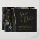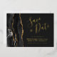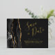 This elegant modern save the date card features a black watercolor agate border trimmed with faux gold glitter. The customizable text combines real gold foil handwriting script, copperplate and italic fonts on an off-black background. The reverse side features a matching black and gold agate design.