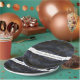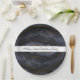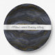 Paper plates with a beautiful image of dark abstract agate stone. Colours swirl in waves. Main colours are black, blue-grey with a faux-gold ribbon running through the design. Modern and trendy.