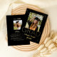 Elegant modern design in black and gold. Add your special photo! The name and year of the graduate are below. The text and gold specs at the top and bottom of the card are in gold foil. The backside has another photo and a personalized message to share with family and friends. The year is customizable and can be changed. There is a choice of different colour foils.