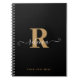 Modern, stylish notebook personalized with a monogram or initials in gold and a name in an elegant, chic handwritten script in white against an editable black background. CHANGES: Change the background colour, choose a style graphic background or change the text font style, colour, size and placement by clicking on CUSTOMIZE FURTHER at the bottom of the PERSONALIZE section. Contact the designer via Zazzle Chat or makeitaboutyoustore@gmail.com if you'd like this design modified or on another product.