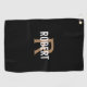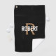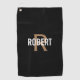 Modern golf towel for him with a gold monogram and white name on a black background. Personalize with name and initial.