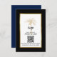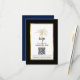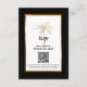 Provide your guests to reply to your wedding invitation and explore your wedding website with this elegant RSVP details and QR code design featuring modern script, black and gold including an artistic palm tree and metallic gold frame on the front of the card. A black background is on the front and back.