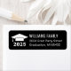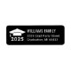 Modern custom address label design features a white grad cap with tassel, class year (can be customized), return address text and black background colour that can be customized to match any school or invitation colours.
