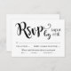 Modern wedding RSVP cards feature a modern black and white colour scheme with bold and playful handwritten calligraphy script typography with stylish scroll details. Personalize the casual yet elegant custom text with your reply due date and guest dinner entree options.