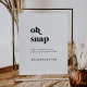This modern black typography Oh Snap wedding hashtag sign is perfect for a simple wedding. The black and white minimalist design features a retro yet contemporary font with a unique rustic bohemian feel. Perfect for any season. Keep it minimal, as is, or add your own graphics and artwork. Personalize the sign with your wedding hashtag.