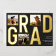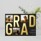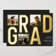 Celebrate your graduation with this modern photo typography graduation foil invitation. This sleek design features luxurious foil typography with the word "GRAD" prominently displayed. The invitation allows you to showcase three of your favourite photos on the front, creating a unique and personalized keepsake. Customize with your name, school, and graduation year on the back to share your achievement with friends and family. Perfect for high school or college graduates, this invitation beautifully captures your milestone moment with a stylish black backdrop.