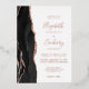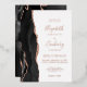The left-hand edge of this elegant modern wedding invitation features a black watercolor agate border trimmed with faux rose gold glitter. The customizable text combines handwriting, copperplate and italic fonts in real rose gold foil on a white background. The reverse side features a matching black and rose gold agate design.