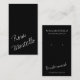 Elegant and simple black earring display card. The template is written in a script font on the front for you to place your first and last name. The back is in a serif style font and you can edit the text to suit your business. Replace with your business name and specialism and edit the greeting and product type if prefered. Perfect for artisan and designers who wish for a simple style to package their handmade jewellery commissions.
