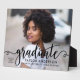 Stylish and elegant graduation plaque sign with easel features a senior photo with "graduate" black script overlay. Personalize the modern custom text with your grad's name, school, and class year. Makes a beautiful keepsake to display in your home!